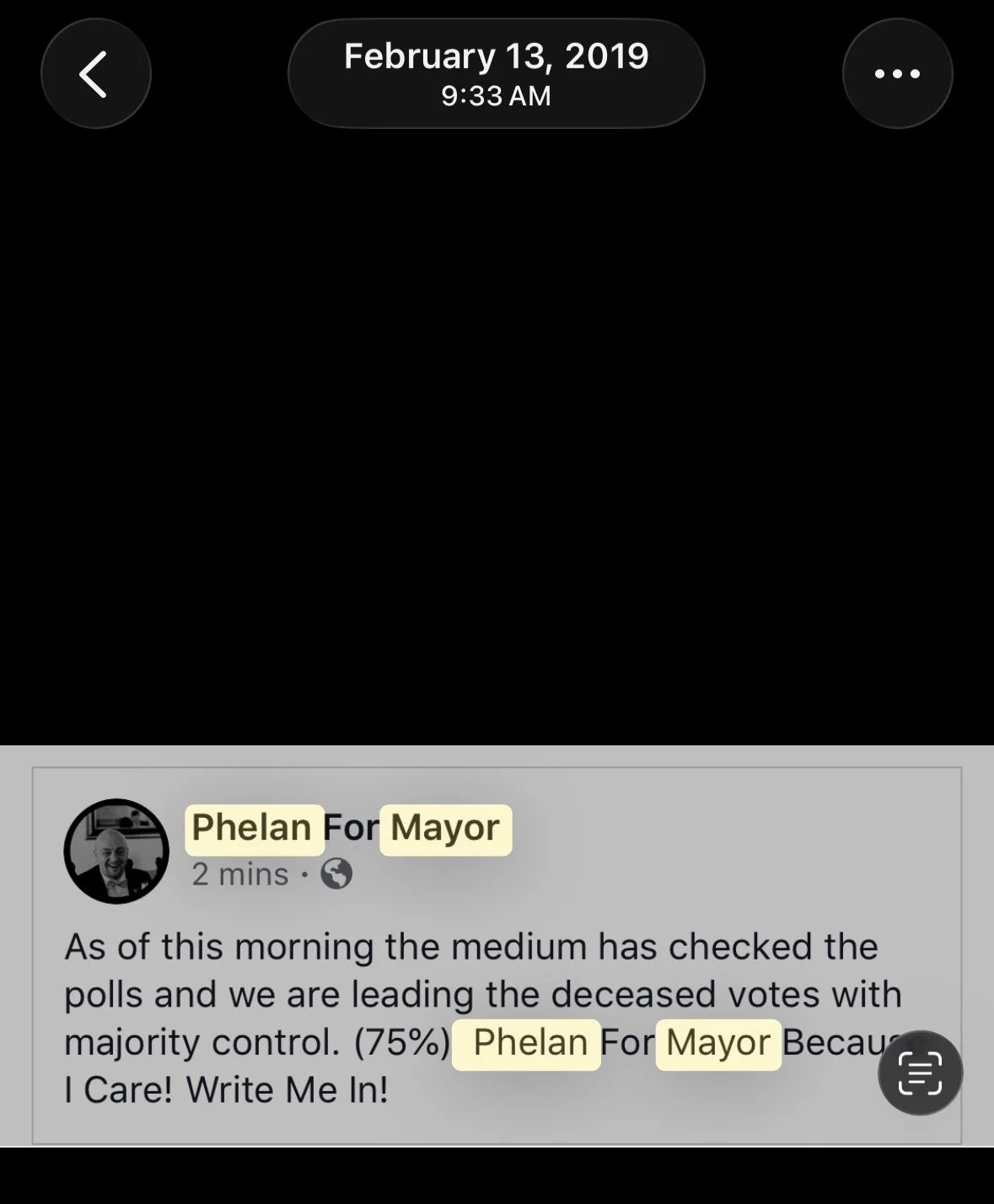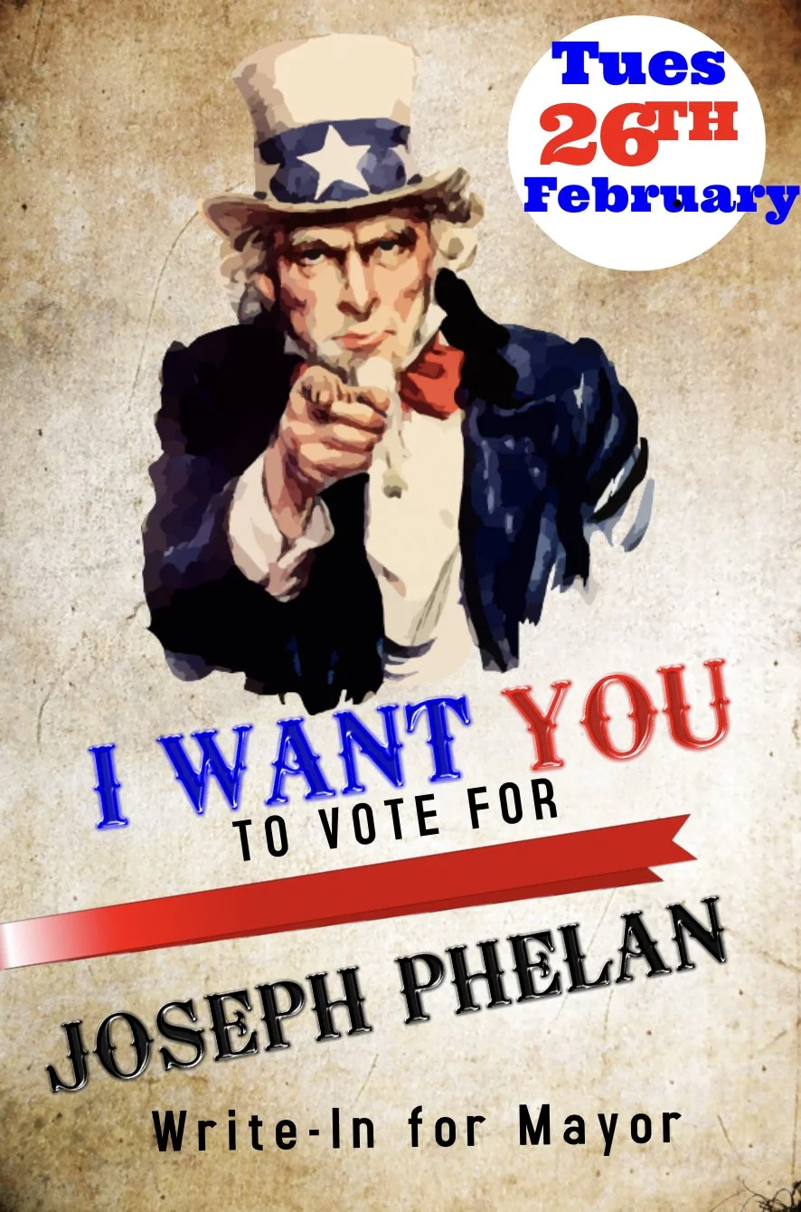 The study of: Phelan for Mayor. Because I Care. Write Me In.