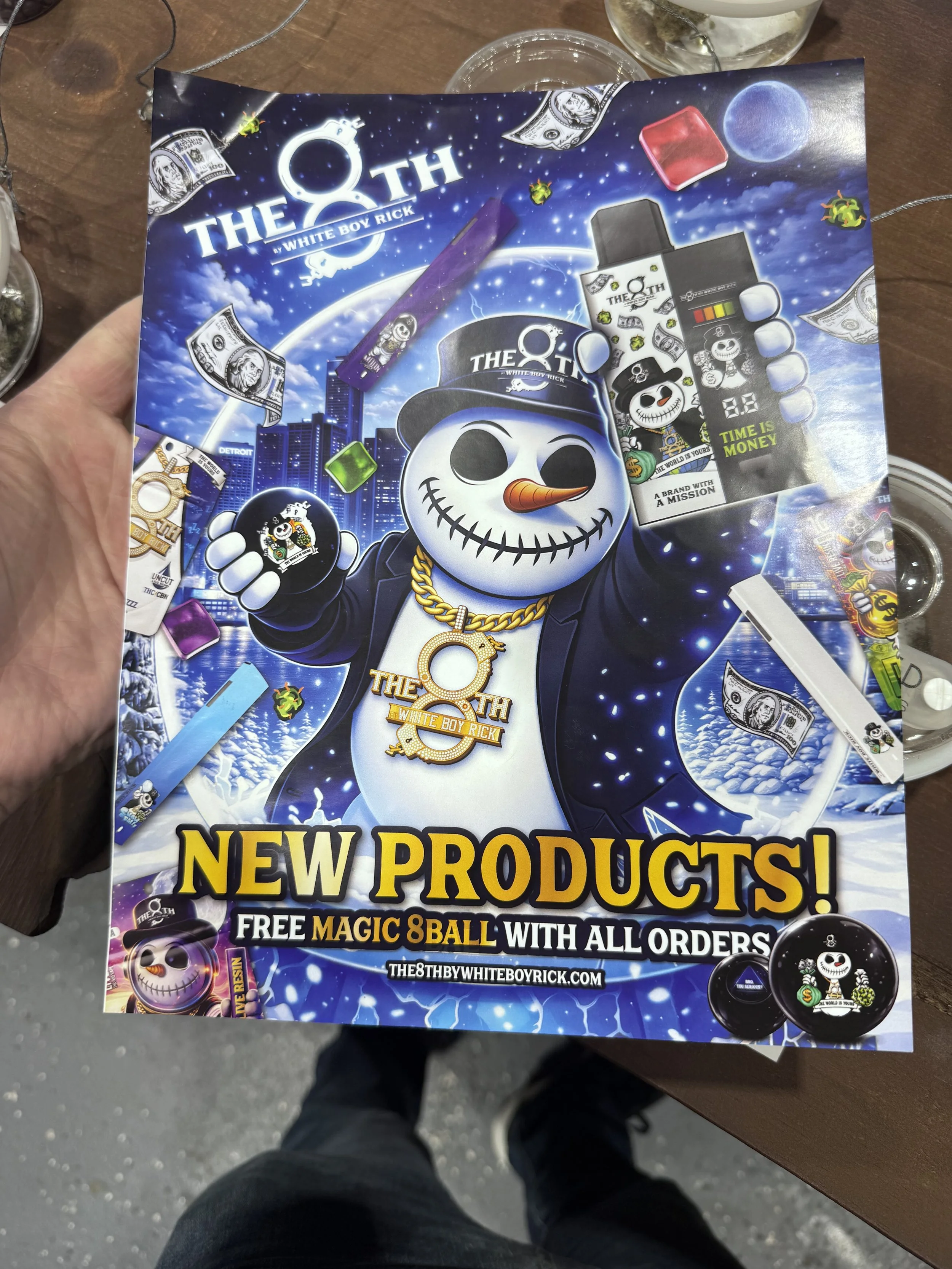 A Magic 8 Ball promotional giveaways tied to cannabis drops from White Boy Rick branded cannabis products blending pop culture + legacy storytelling